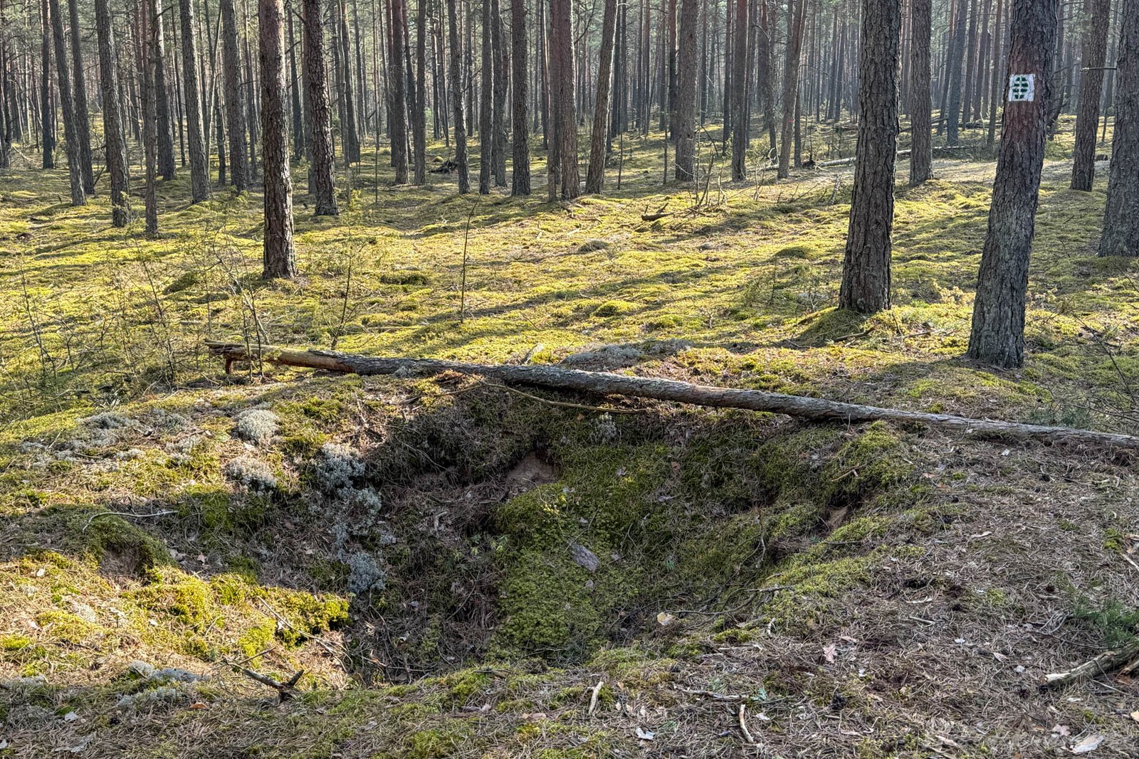 Fotografuoju stende nupieštą maršruto schemą. Ji pakankamai smulkaus mastelio ir gali praversti tik bendrai orientacijai. Tačiau atsarginį planą reikia turėti, juk nežinau koks ženklinimas laukia manęs šiame maršrute. Mano laimei, šis klausimas išsisprendžia gana greitai ir teigiamai. Eidamas per Puvočius pastebėjau ant medžių ir stulpų paženklintus maršrutus. Jų čia ne vienas, tačiau partizanams skirtą pažintinio maršruto ženklinimą atskirti nesunku – tai tamsiai žalios spalvos granatos formos simbolis baltam fone. Nei trupučio neperdėdamas galiu teigti, jog šio maršruto ženklinimas – nepriekaištingas.