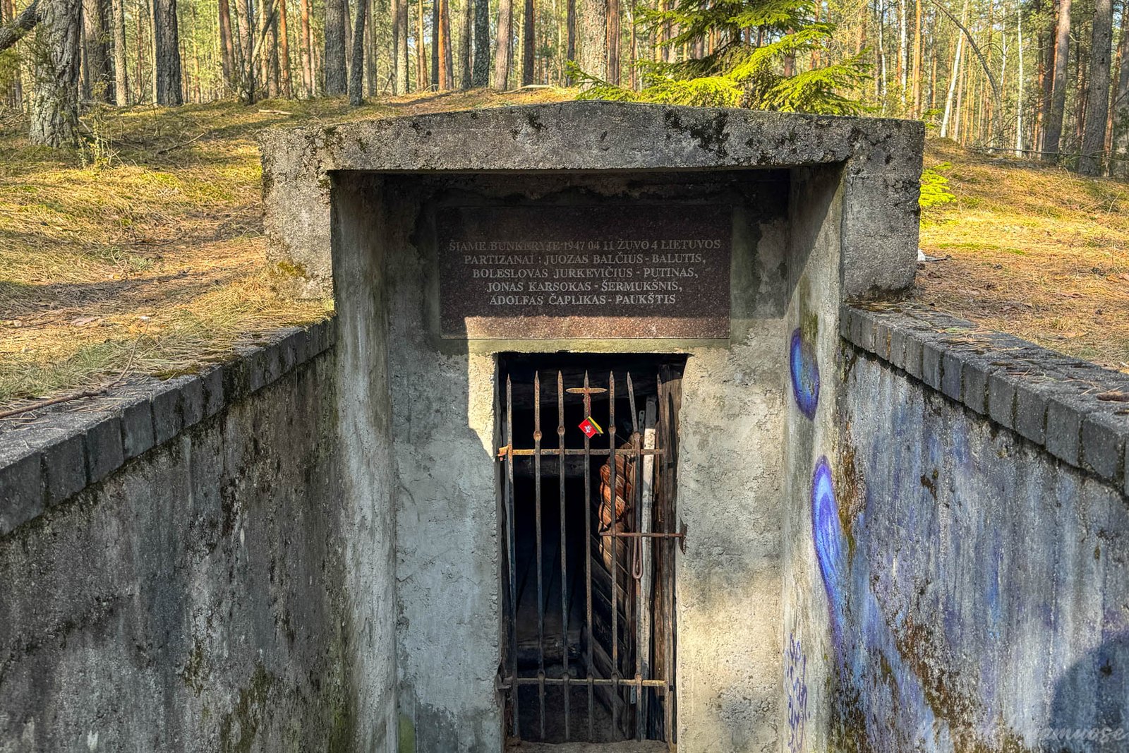 Šias atmintinas vietas skiria kelių šimtų metrų atstumas, kurias aplankius reikia grįžti į kelią, vedantį link žūties vietos. Pažintinis maršrutas ne tik gerai paženklintas, bet įrengtos ir papildomos rodyklės, todėl orientuotis tikrai paprasta. Netrukus prieinu ir Dainavos apygardos Merkio rinktinės Gardino tėvūnijos partizanų žūties vietą. Virš grotomis uždaryto bunkerio užrašas skelbia, jog jame žuvo 4 partizanai. Čia buvo Juozo Balčiaus – Balučio vadavietė. Iš toli matosi prie informacinio stendo pritvirtinta plevėsuojanti trispalvė. Greta yra kapas, stovi paminklas.