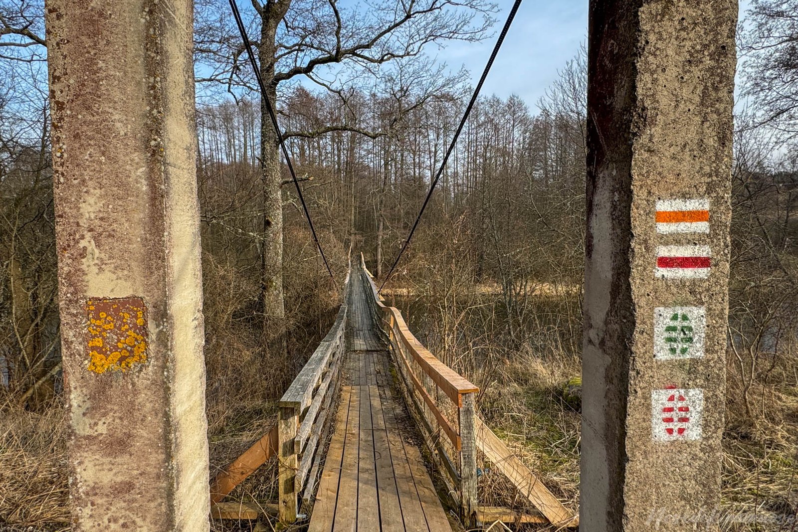 Puvočiai lieka už nugaros ir kelis šimtus metrų tenka eiti asfaltuotu keliu. Dar labai ankstyvas pavasaris. Be galo, be krašto mėlyname danguje pakibusi saulė dosniai skleidžia šilumą. Ne taip karšta kaip prieš metus žygiuojant iš Merkinės, tačiau ir laikas dar kitas – beveik mėnesiu anksčiau. Dar tik pradeda skleistis kačiukai, žemė skleidžia džiūstančios žiemiškos drėgmės kvapą, o ir ramybę drumsiantys paukščių balsai dar labai reti. Matau dar ledu padengtą dalį tvenkinio. Ir mažą upokšnį, kurį veikiau girdžiu nei matau. Jį sukaustęs ledas dar pakankamai storas.