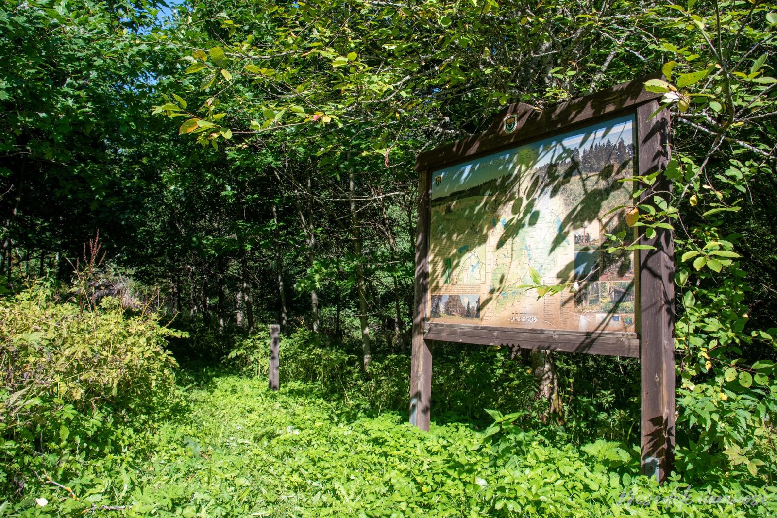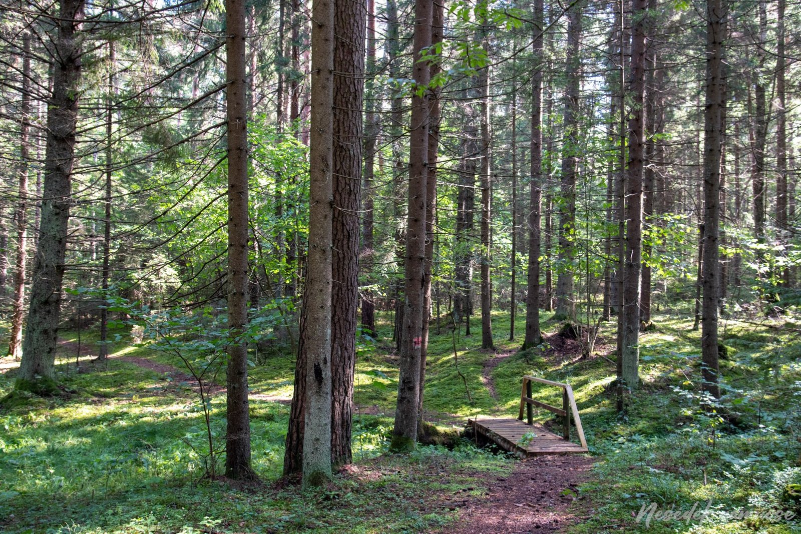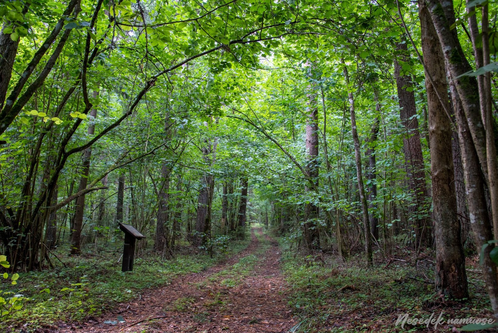 Nuo poilsiavietės miškas vėl tampa niūresnis ir tamsesnis. Medžių laja ypač tanki ir žemę pasiekia tik vienas kitas saulės spindulys. Net ir informacinis stendas tokiomis sąlygomis apsitraukė žaluma ir tapo neįskaitomas. Tokiu pavėsingu miško keliuku pasiekiau asfaltuotą kelią ir čia susiduriu su esminiu klausimu – kur toliau eina maršrutas ir ar jis iš viso dar tęsiasi? Raudonos spalvos ženklinimas ant medžių baigėsi, tuo pačiu iškeldamas klausimą – ar tai tikrai buvo pažintinio tako ženklinimas? Pastebėjau ir tai, kad iki šiol pažintinis takas sutapo su dviračių maršruto ženklinimu. Nežinau, ar norėčiau važiuoti dviračiu tokiu dviračių maršrutu, tačiau dabar reikėjo nuspręsti – eiti toliau ar apsisukti?