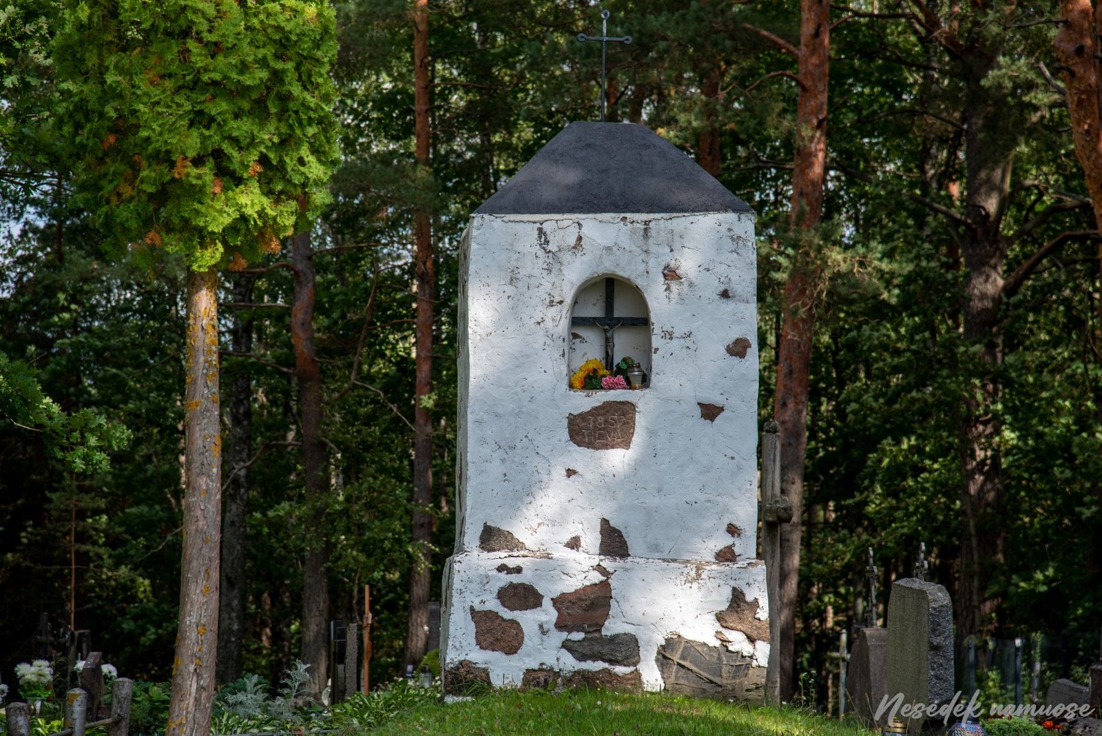 Pagal pirmame informaciniame stende parodytą schemą pažintinio tako maršrutas tęsiasi tolyn palei kelią. Palei kelią jokio tako nėra, todėl eiti reikia kelkraščiu. Nusprendžiu eiti. Eismas neintensyvus ir eidamas keliu greitai prieinu Aučynų kaimo kapines ir kryžių. Pakeliui dar pasižvalgau po kalvotas šventų vietų apylinkes. Patinka paieškoti gražių kraštovaizdžių, įdomesnių perspektyvų ar tiesiog standartiniame lietuviškame peizaže pastebėti paprastumo žavesį. Kartais tai pastebiu iš karto, o kartais – tik peržiūrėdamas nuotraukas.